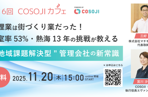 2025年11月20日(木)に、第16回COSOJIカフェを開催する運びとなりましたので、ご案内申し上げます。 空室率53%の熱海で見つけた管理業革命! もう「仲介・開発が王道」なんて古い!管理業こそ...