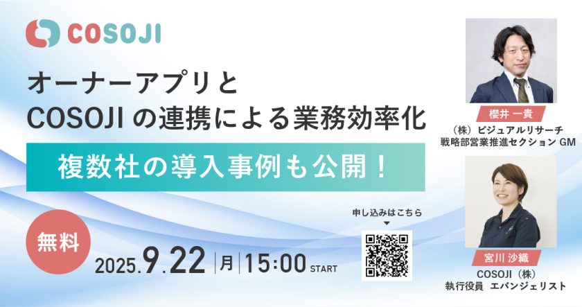 2025年9月22日(月)に、「オーナーアプリとCOSOJIの連携による業務効率化」をテーマに、無料ウェビナーを開催いたします。